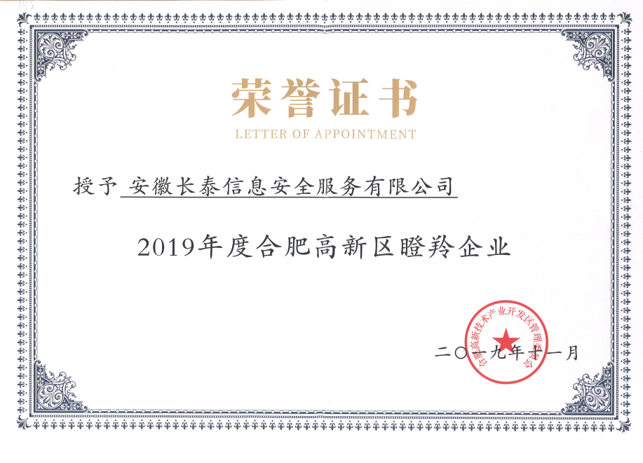 2019年,11月20日,合肥高新区2019年高成长企业榜单正式发布,高新区共认定了502家高成长企业,其中雏鹰企业275家、瞪羚培育企业72家、瞪羚企业149家、潜在独角兽企业3家、独角兽企业1家、平台型龙头企业2家。作为其中的高科技企业——安徽米兰官方端网站登录入口-米兰中国)成功入选瞪羚企业榜单。